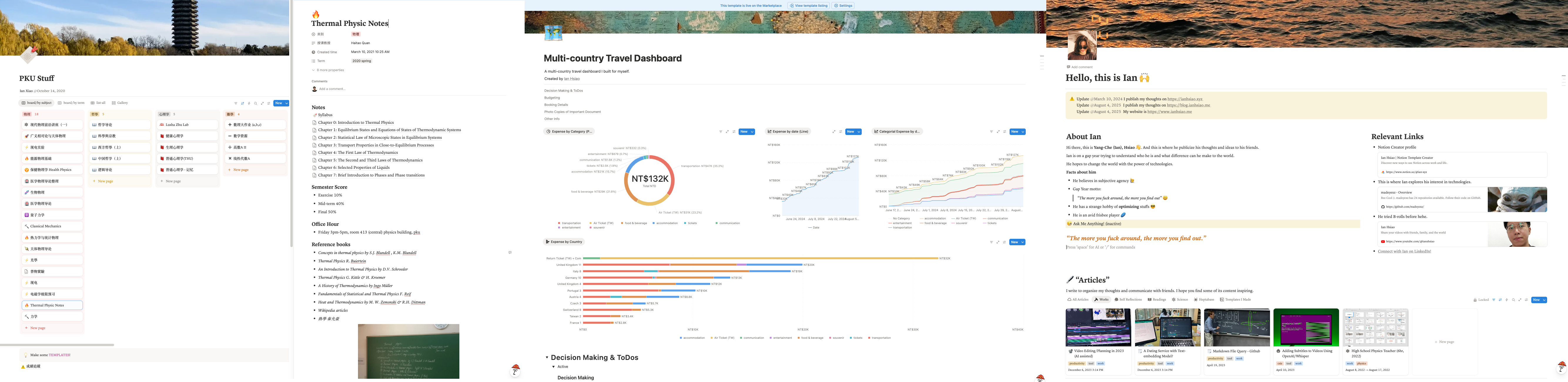 the Notion softwares I built for course management, travel budget monitoring, and personal website