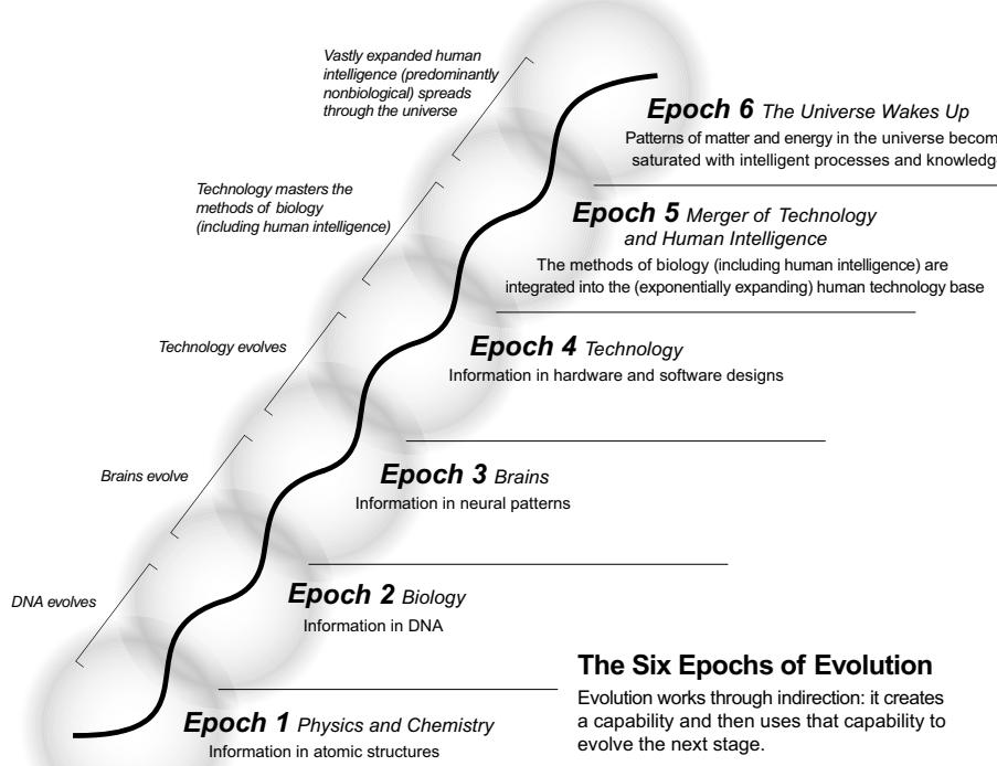 In Singularity is Near, the author argues that evolution works in a compounding way, with each generation of intelligence developing on top of the previous generation, "it creates a capability and then uses that capability to evolve the next stage". Atoms build molecules, molecules build amino acids and proteins, proteins built brains, brains built machines, and maybe we can merge with machines and transcend biological constraints. In this interpretation, machines will eventually expand human consciousness throughout the universe, it's more anthropic.