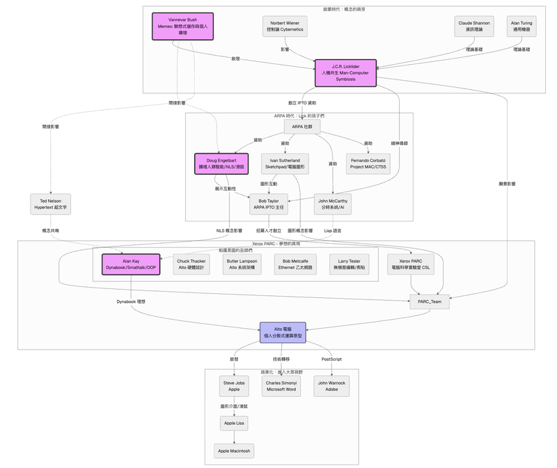 這大概是現代管理的根本兩難,甚至是任何民主政治的根本挑戰;領導者們已為之掙扎了數個世紀。幸運的是,Taylor 剛在 NASA 與 ARPA 度過了將近十年,提供了無數可供借鑒的模型。「我四處旅行,」他說,「與人交談,研究不同場域的文化,學習它們是如何運作的。我特別花很多時間與 ARPA 團隊中最年輕的人聊天——那些真正動手做事、主意最多的人。我了解了他們的價值觀,什麼有效、什麼無效。於是在施樂,我把我喜歡的付諸實踐,丟掉其餘。」 「有一條思想的脈絡從 Vannevar Bush 經 J. C. R. Licklider、Doug Engelbart、Ted Nelson 一路到 Alan Kay——一條通往人類進步的線索。那像是聖杯。我們會把任務合理化為 Xerox 所需,諸如此類。但每當我們能把一個想法以那條脈絡來表述時,突然大家眼睛都會亮起來,你就會擊中那個共鳴頻率。」 他認為這段歷史要放在當時的整體脈絡中衡量:1970 年代中期,幾乎所有大型企業都在摸索電腦與微電子時代的商業模式:沒有人能確定市場會選擇什麼。PARC、DEC、IBM,甚至車庫的業余愛好者都在試試看,找出什麼奏效、什麼不奏效,繼續探索未知。 一直如此。「Lick 在智識上鮮活到不能再鮮活,」Bob Kahn 回憶說。Kahn 常在 ARPA 看到那雙藍色眼睛閃爍,即使是在 Lick 和 George Heilmeier 奮戰最艱難的時期。「沒有任何一個主題是你提得出、而他沒有在腦中篩過、排列過很多次的。他總是在變出情境。『假設我們有這個,再來一些那個,那我們在那邊就會得到有趣的東西,對吧?』他會用這種方式提出讓你大吃一驚的點子,比如他證明世界不可能是宇宙電腦模擬:如果是,那麼上帝早就會發現像 Nixon 這樣的臭蟲並把它修好!然後他總是在問對話式的問題。這整個互動性的概念就是他性格的一部分。你若問他什麼,他會回你:『嗯,你聽過 XYZ 嗎?那不是和你的問題有關嗎?你怎麼看?』你不可能和他互動卻不參與其中。」